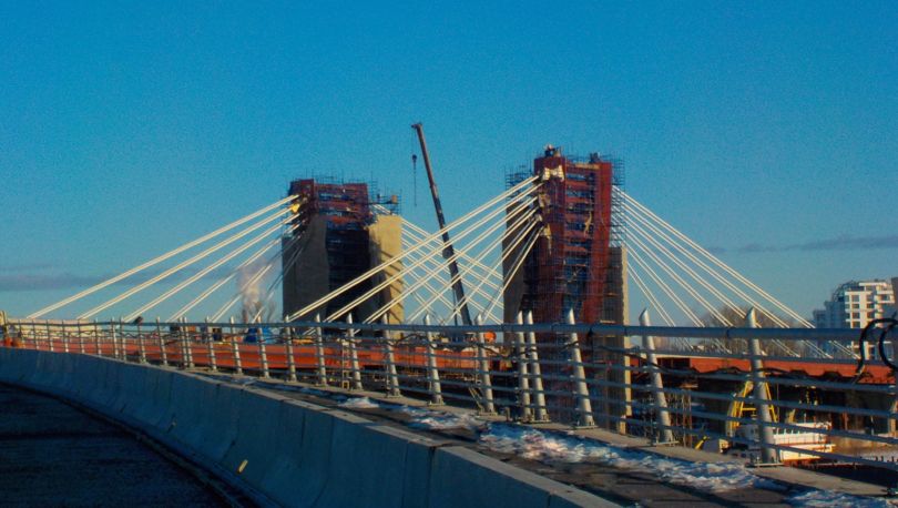 На объекте сейчас идет установка ж/б плиты мостовых пролетов 13-15, строители кладут мостовое полотно в пролетах 10-13, окрашивают металлоконструкции, монтируют опоры освещения, ливневую канализацию, шумозащиту.