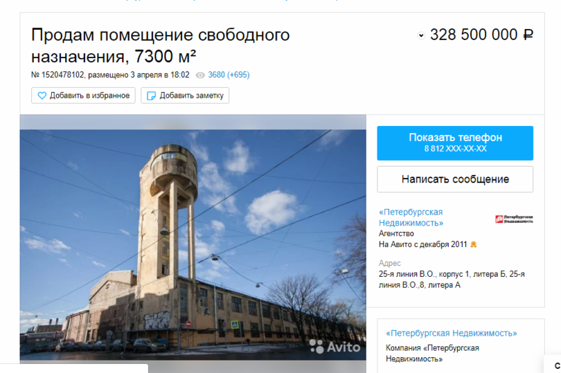 Продавец расписывает преимущества объекта: «Фасады здания выходят на первую линию улицы, а расположение в историческом и туристическом районе, вблизи достопримечательностей (Ледокол Красин, порт Севкабель, Горный институт) обеспечит большой клиентский поток и отличную визуальную доступность».