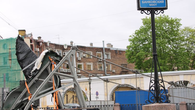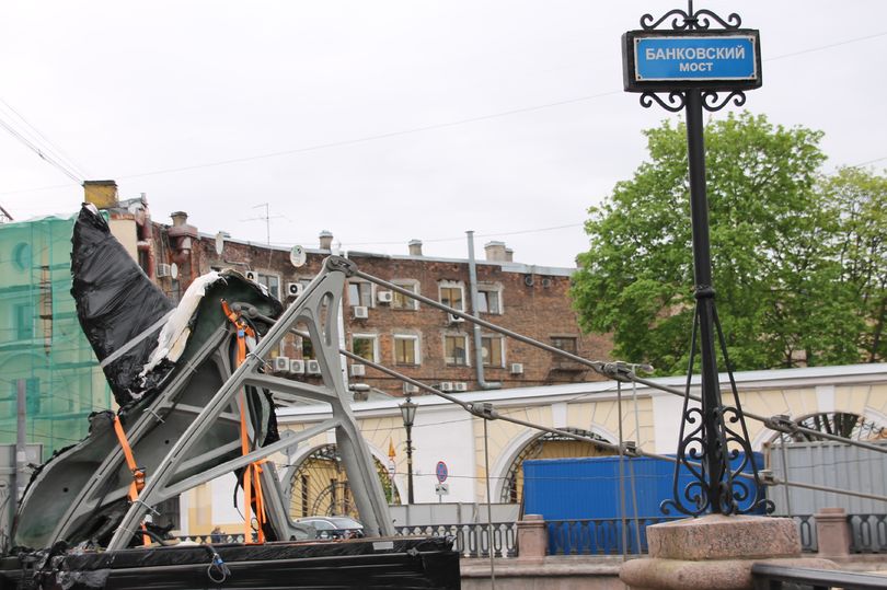 Грифоны были демонтированы для капитального ремонта Банковского моста. Внутри скульптур были скрыты несущие конструкции, удерживающие ванты и уходящие в землю.