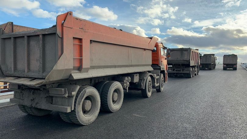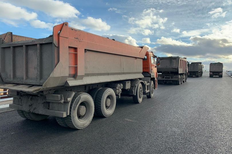 Четыре гружёных автосамосвала с полным весом каждого автомобиля 39 тонн испытали на прочность путепровод в районе проспекта Ленина, который строится в рамках проекта транспортного обхода Красного Села.
