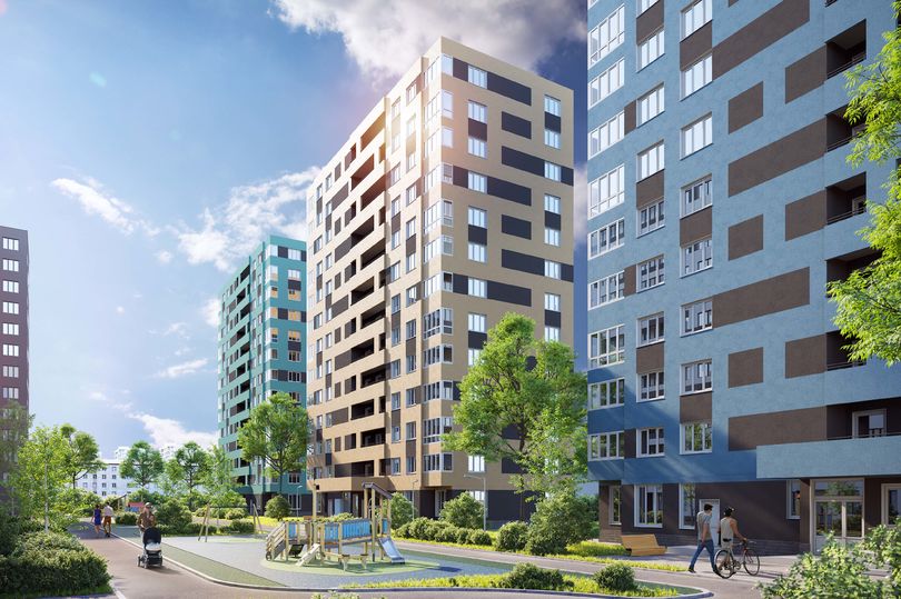 Внутренняя территория комплекса будет озеленена, здесь появятся прогулочные дорожки, детские и спортивные площадки, на территории комплекса запланировано строительство школы и детского сада.