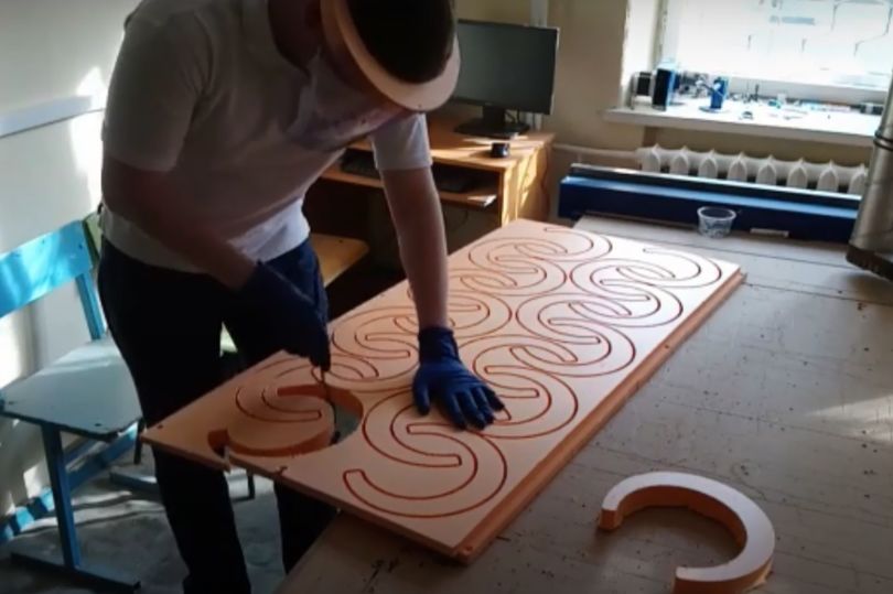 Конструкция была разработана сотрудниками центра, технология предусматривает изготовление обода из плиты ПЕНОПЛЭКС®. на фрезерном станке с последующим креплением прозрачного экрана из прочного поливинилхлорида 1 мм толщиной. Благодаря прочностным характеристикам плит, обод из них вырезается достаточно быстро, за счет их упругости изделие плотно прилегает, а минимальный вес позволяет носить такое средство индивидуальной защиты достаточно долго.