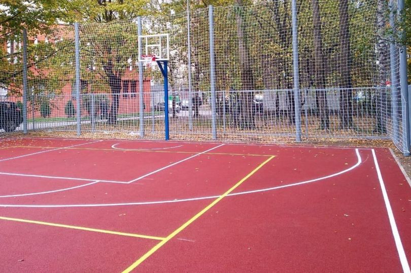 Универсальная площадка предназначена для игры в баскетбол и волейбол, а также для свободных спортивных занятий. Площадь спортивного сооружения составляет 394 кв. м. Пространство отвечает современным требованиям безопасности: резиновое покрытие смягчает удары, не скользит и сохраняет устойчивость вне зависимости от погодных условий. Благодаря системе освещения, на площадке можно с комфортом заниматься спортом в темное время суток.