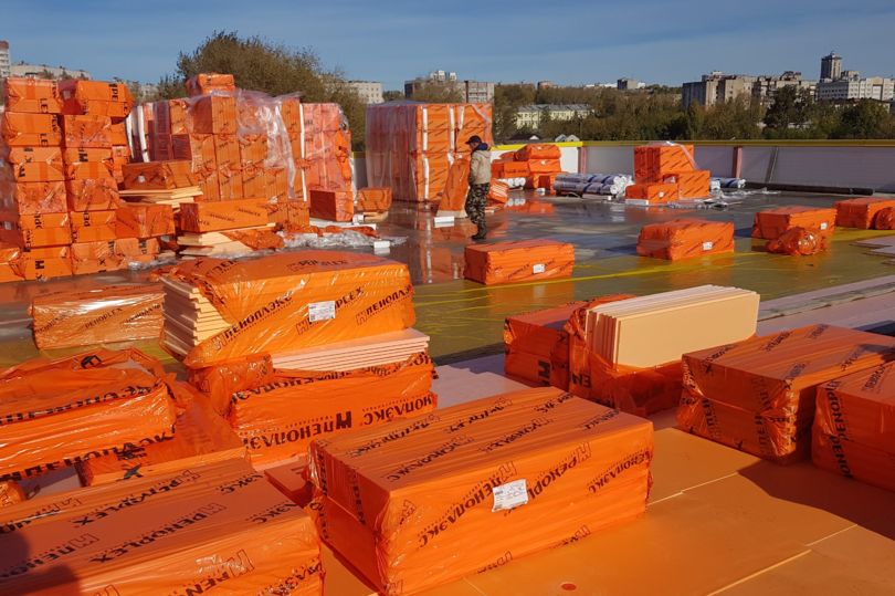 Кровля торгового центра в Кирове на ул. Деповской, 2 обустраивается с применением изделий производства ООО «ПЕНОПЛЭКС СПб»: высококачественных теплоизоляционных плит и сегментов для создания уклонообразующего слоя.
