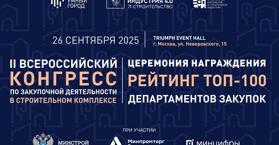 26 сентября 2025 г. в Москве состоится II Всероссийский Конгресс по закупочной деятельности в строительном комплексе, где лучшие директора по закупкам встретятся с ведущими поставщиками строительного комплекса.