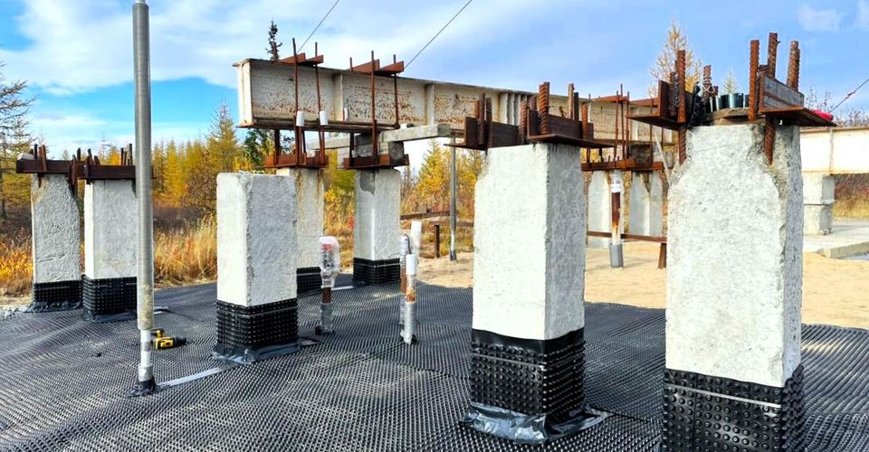 Как правило, здания и сооружения в арктической зоне возводятся с проветриваемым подпольем – открытым пространством между первым этажом и грунтом. Оно защищает мерзлоту от воздействия тепла, поступающего из зданий. При этом на грунте устраивается покрытие для отвода воды. Традиционно эту роль выполняет бетонная стяжка, срок службы которой в условиях Крайнего Севера не превышает и года.